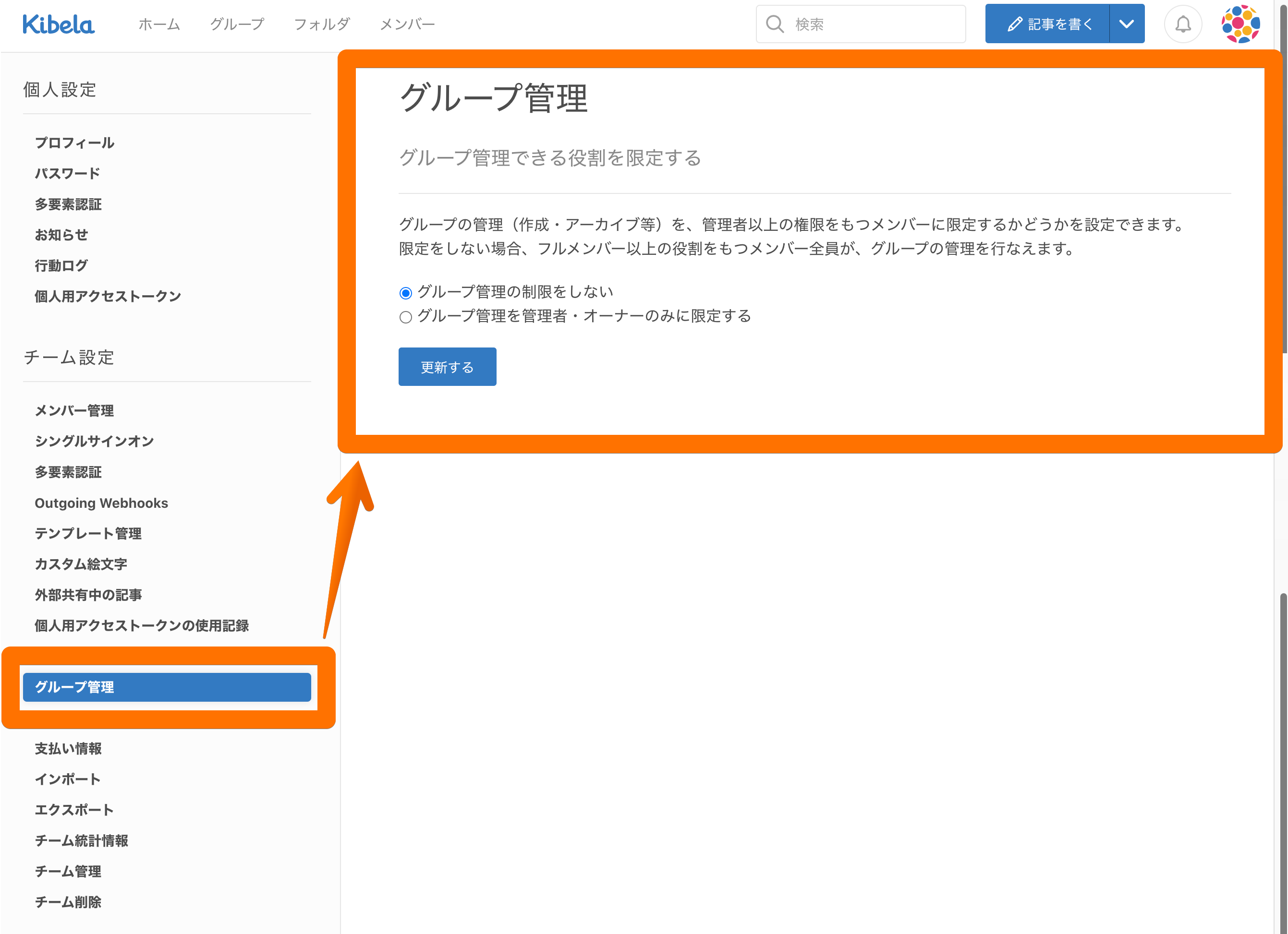 「グループ管理を管理者・オーナーのみ」が選択されている場合、以下グループ操作は管理者・オーナー限定となります。