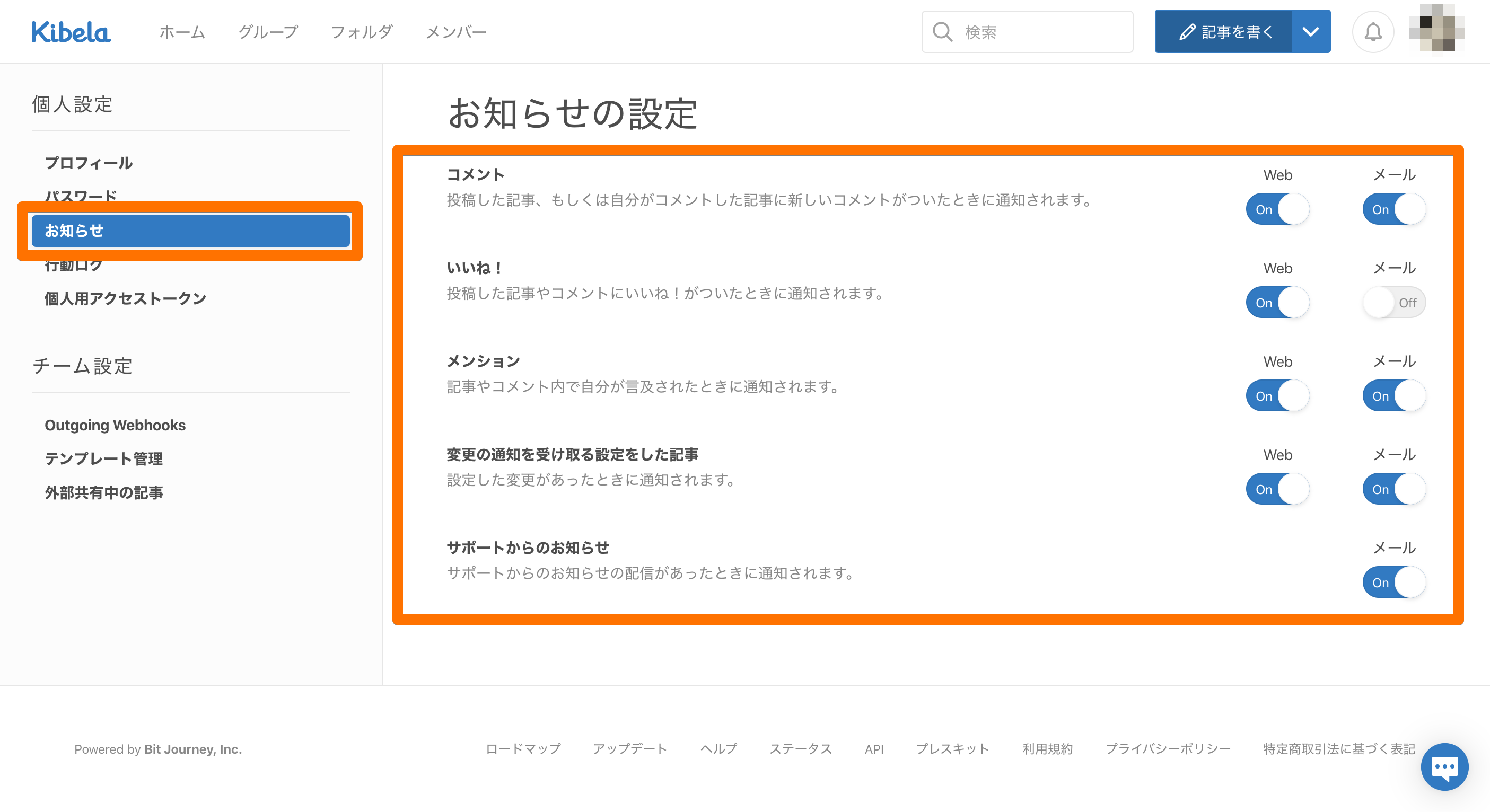 - 通知する種類と方法を設定(Kibela内でのWeb通知・メール通知の2種類から選択できます。)