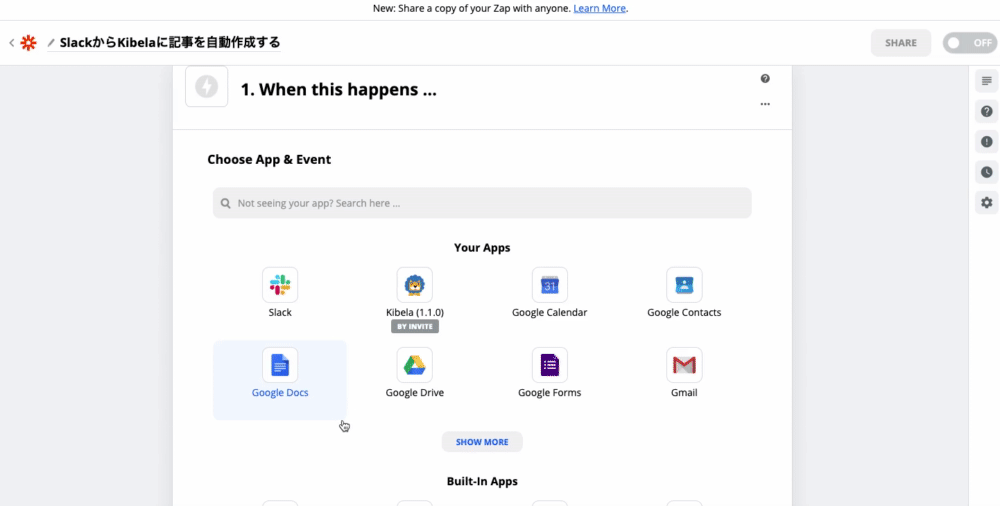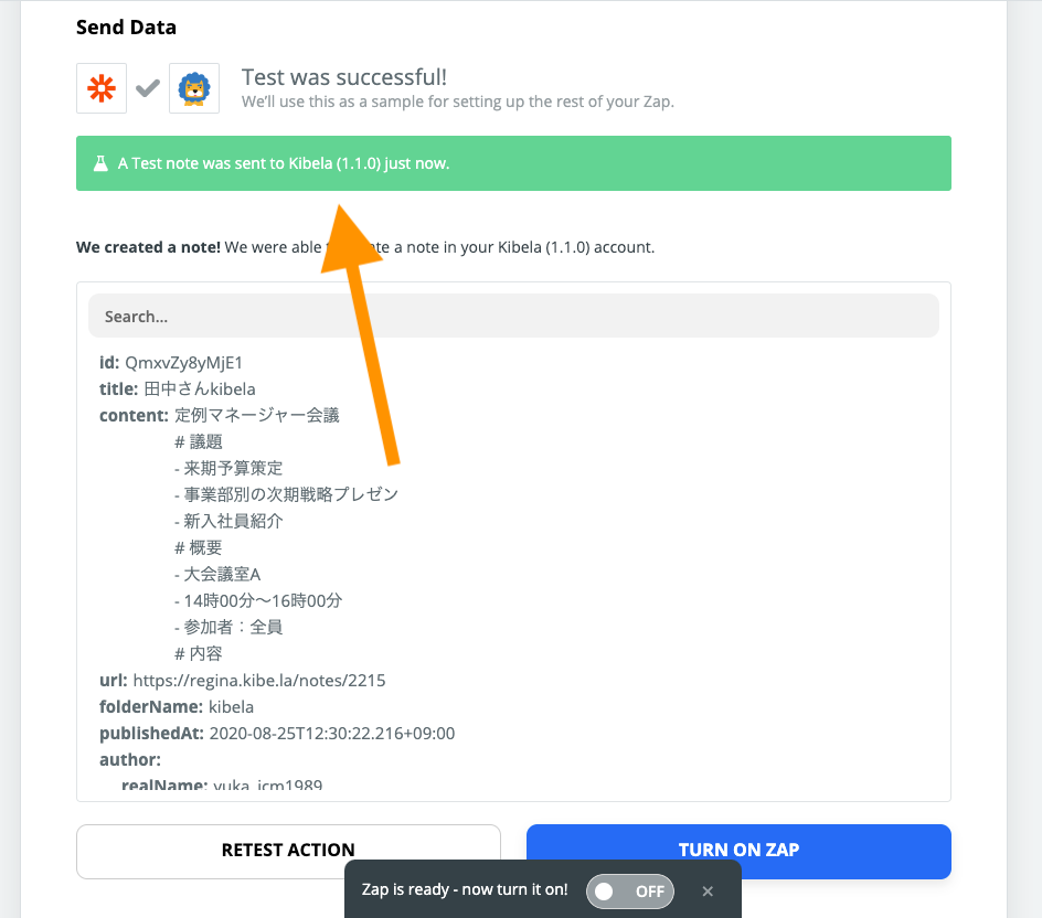 Check if the note has been created on Kibela. - Click “Turn on zap.”