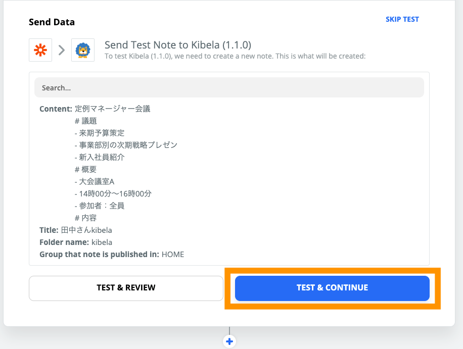 - “Click “Test & Continue.” If the test is successful, you will see the message “A test note was sent to Kibela just now” both on Zapier and on Kibela.