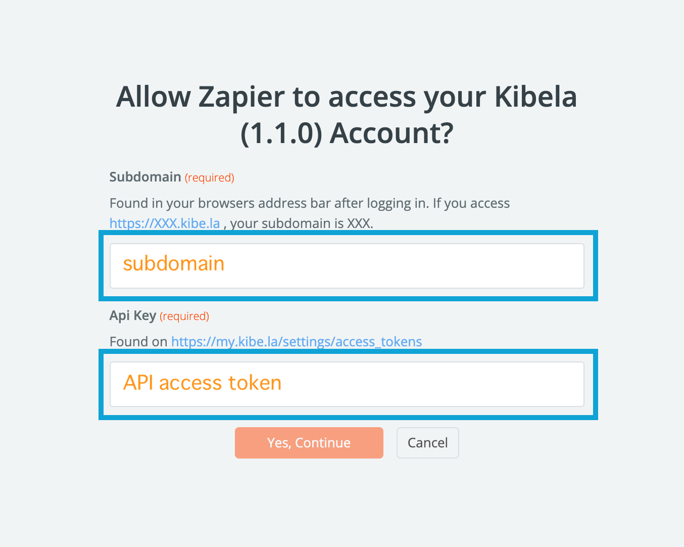 Enter the Kibela team account domain (the domain name is the text between https://******.kibe.la/ ) and the API access token (click here to learn how to obtain the access token).