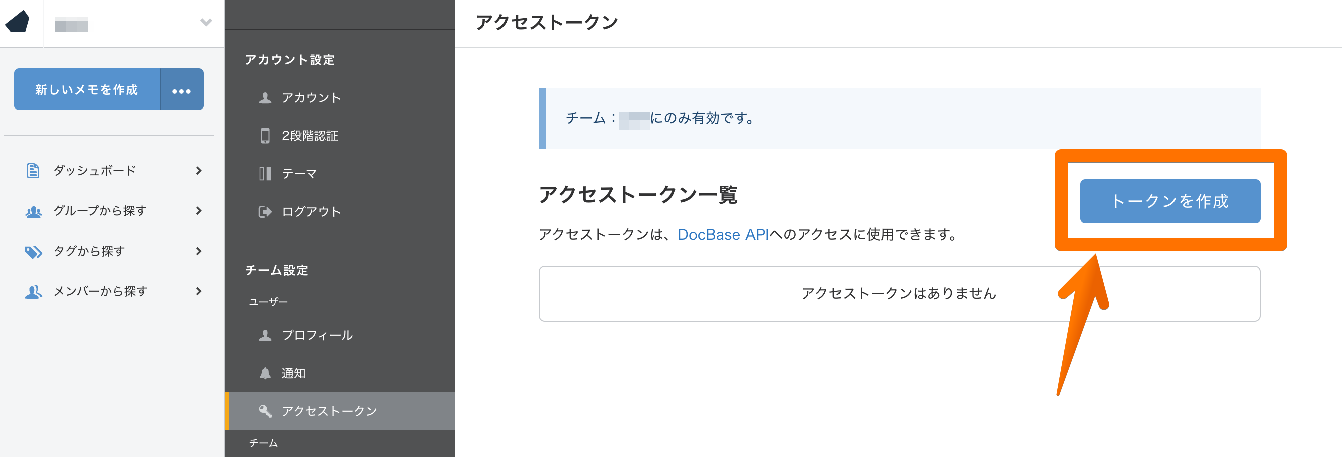 - https://**チーム名**.docbase.io/settings/tokensへアクセスし、API token(アクセストークン)を取得します。「トークンを作成」をクリック。