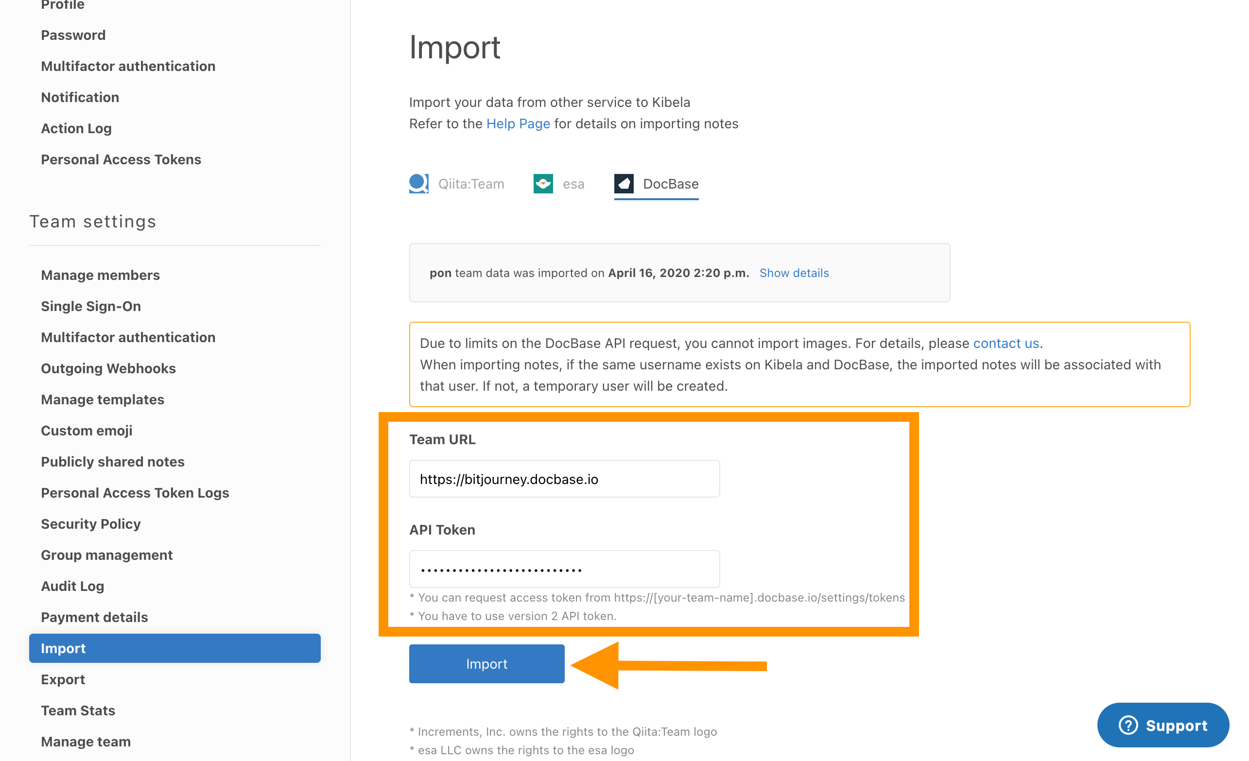 - Go to the Kibela Import page. Select the DocBase tab and enter the DocBase team URL and API access token (from step 3). Click “Import.”