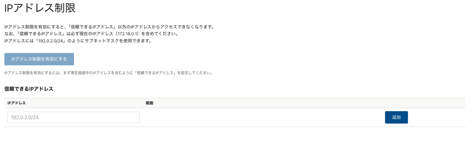 なお、IPアドレス制限はKibelaにアクセス中のIPアドレスが「信頼できるIPアドレス」に追加されている場合のみ有効にできます。