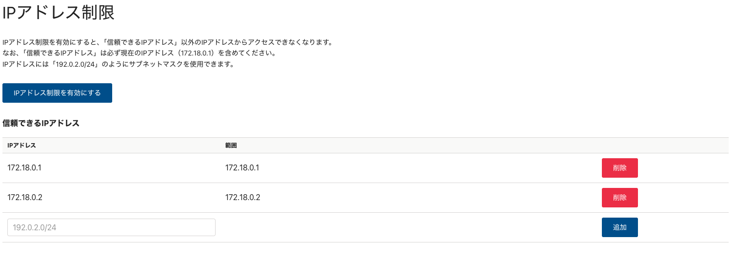 (アクセス中のIPアドレスが「信頼できるIPアドレス」に追加された状態)