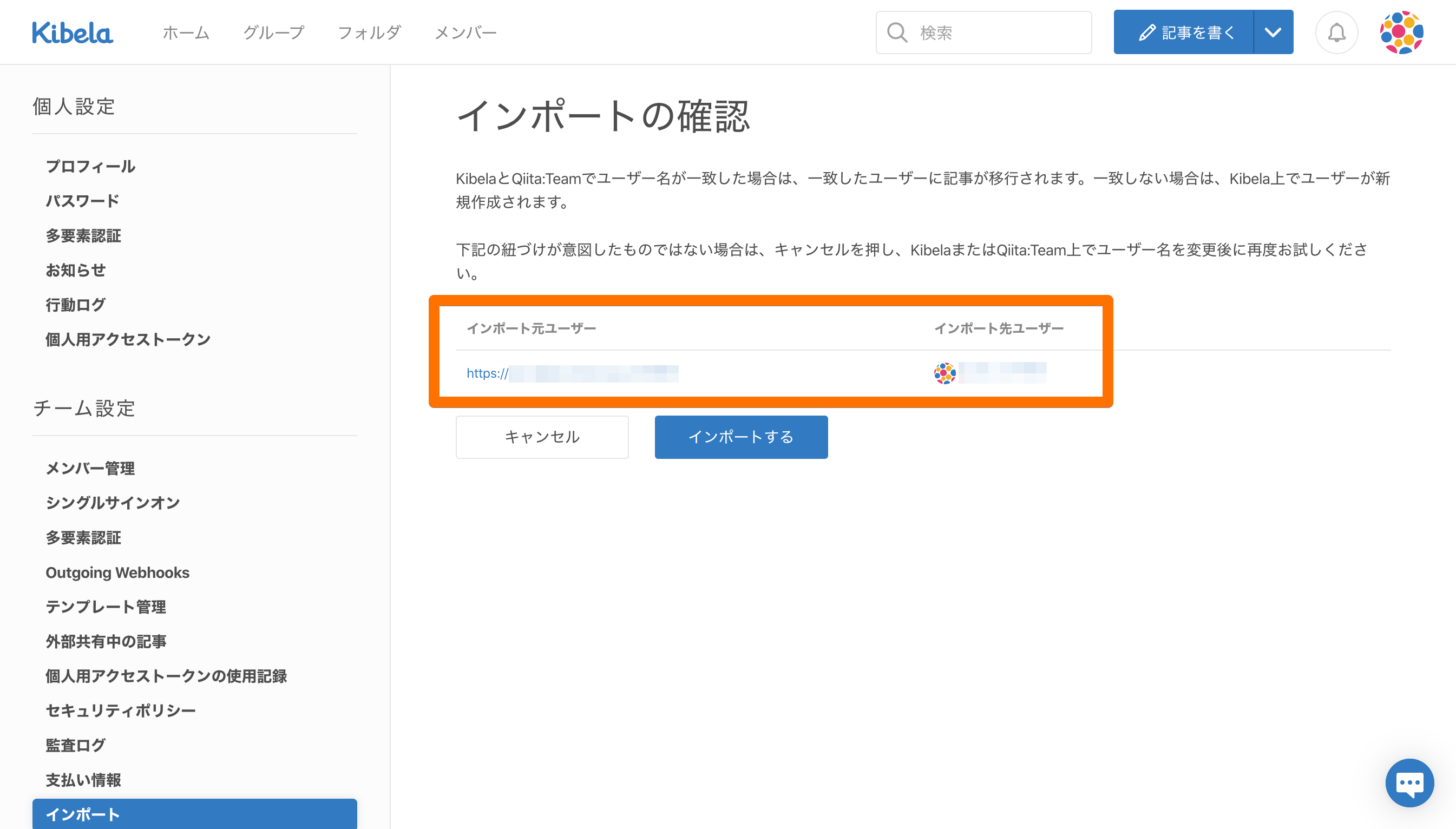 インポート実行前に確認を行います。Kibelaアカウントのユーザー名とQiita Teamのアカウント名が一致している場合は、下記表示となります。問題なければ「インポートする」をクリック。