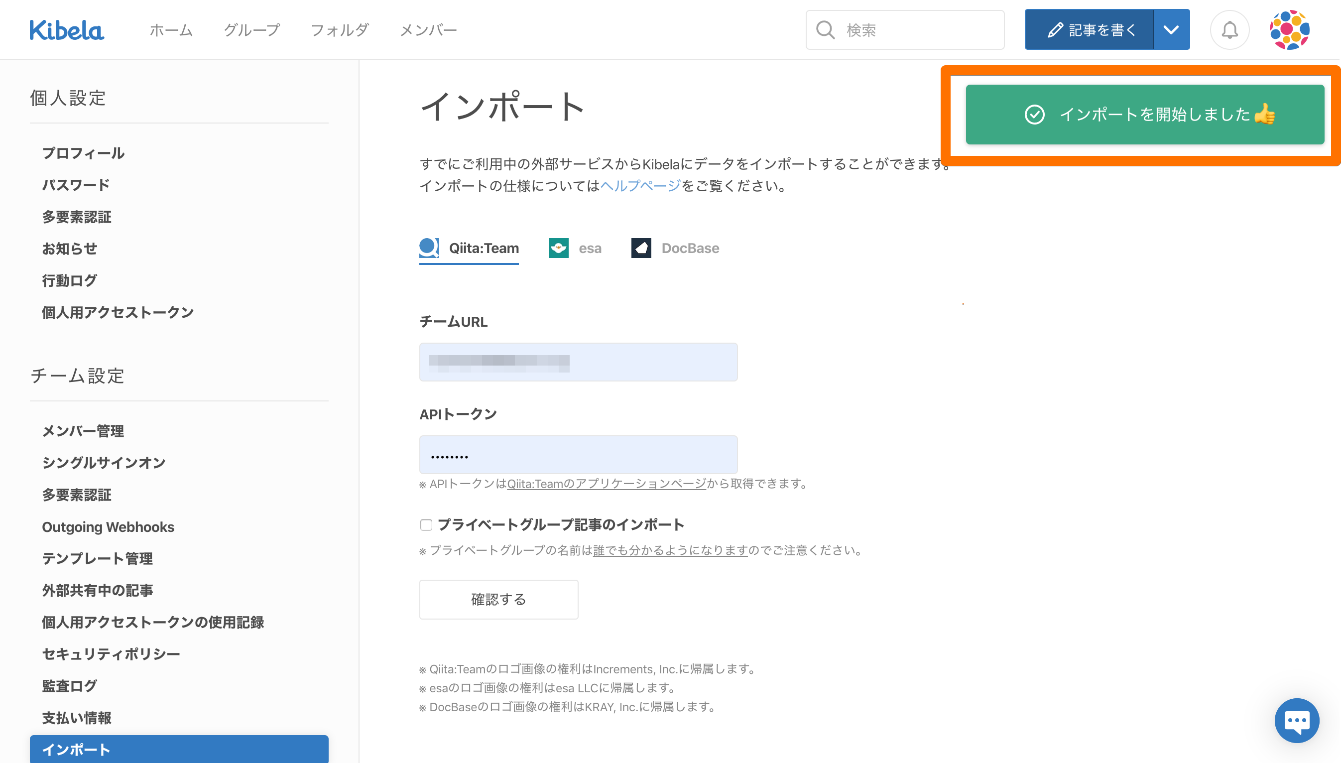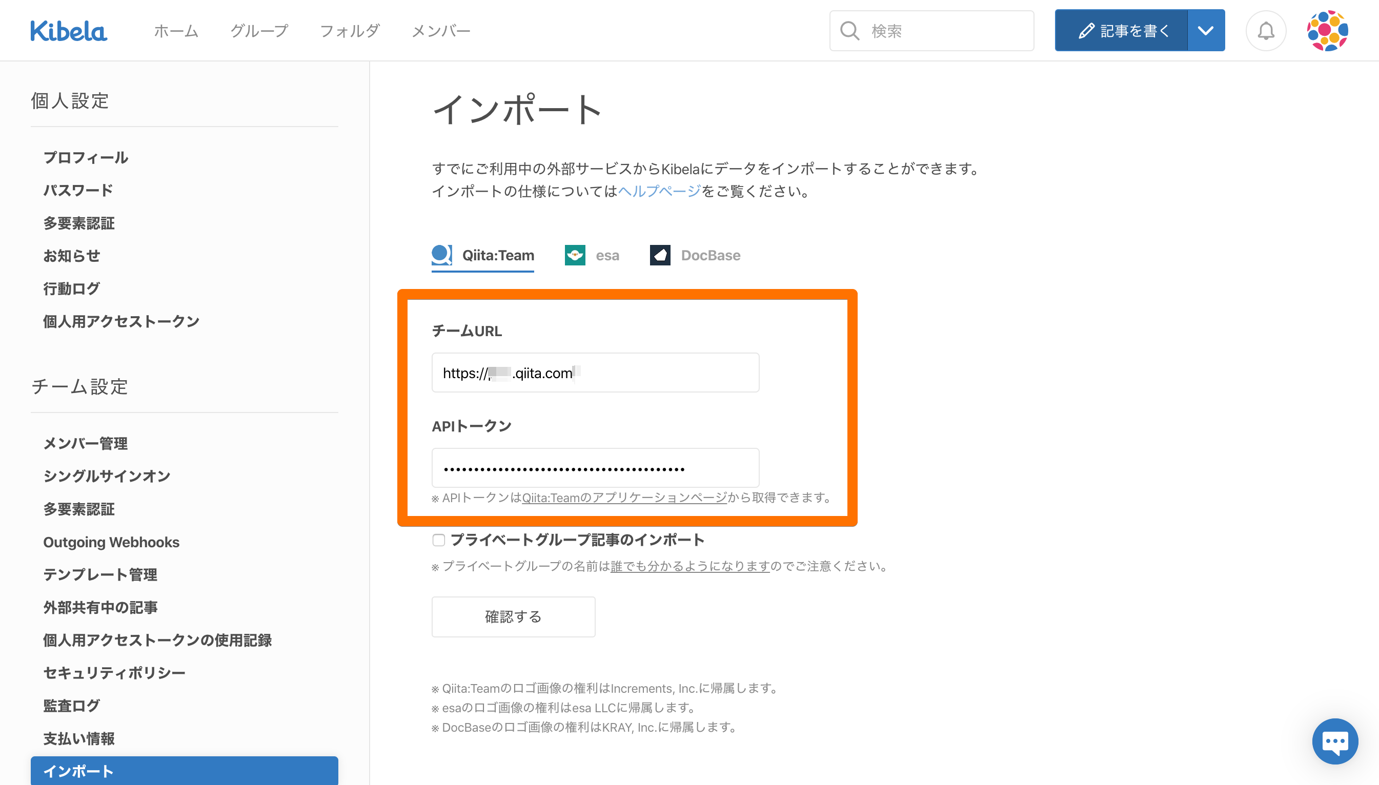 - Kibelaのインポートページへ遷移。Qiita Teamタブを選択しQiita TeamのチームURL、APIトークン(先程取得した個人用のアクセストークン)を入力。